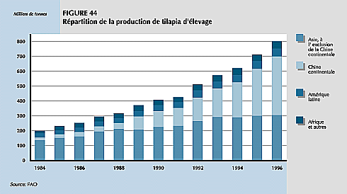 Les tilapias ont un marché établi et en expansion rapide aux Etats-Unis. Ce poisson est également vendu au Japon et en Europe. La production mondiale de tilapia d'élevage n'a cessé d'augmenter (à un taux moyen de 12 pour cent par an4) depuis 12 ans (figure 44). Il est permis de penser que la production de tilapia poursuivra son expansion pour les raisons suivantes: