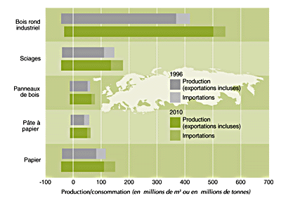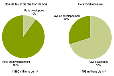 Les tendances globales de production et de consommation diffèrent de façon évidente entre les pays développés et les pays en développement. Les premiers comptent pour 70 pour cent dans la production et la consommation mondiales de produits industriels du bois. Les pays en développement, en revanche, produisent et consomment environ 90 pour cent du bois de feu et du charbon de bois, combustibles qui constituent la principale source d'énergie des ménages dans bon nombre des pays concernés (voir figure 3). On consomme chaque année dans le monde plus de bois de feu et de charbon de bois que de bois rond industriel, et la demande de bois de feu devrait continuer de croître à un rythme d'environ 1,1 pour cent par an jusqu'à l'an 2010, alors que l'on prévoit, pour la demande de bois rond industriel, une hausse d'environ 1,7 pour cent par an pendant la même période. Plusieurs facteurs sont de nature à influencer la manière dont il sera répondu à ces demandes croissantes: l'expansion des sources de bois, provenant notamment des plantations et des arbres situés hors forêt, l'amélioration des procédés de traitement du bois et de leur rentabilité, et le recours accru aux fibres recyclées et non ligneuses. Enfin, les échanges commerciaux poursuivront leur rôle régulateur entre les déficits et les excédents des différentes régions du monde.