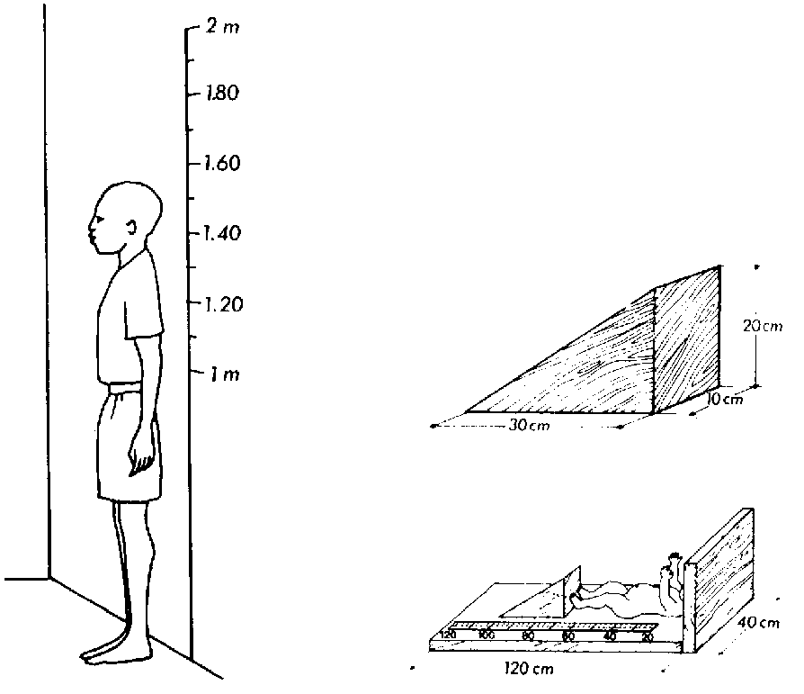 Un autre moyen, mais moins satisfaisant, est de placer un banc de bois que l'on trouve dans la plupart des dispensaires et des écoles contre un mur dans un coin de la pièce et de le graduer en centimètres à partir du mur, de 50 cm à1,50 mètre. Là encore on se sert du triangle pour caler les pieds.