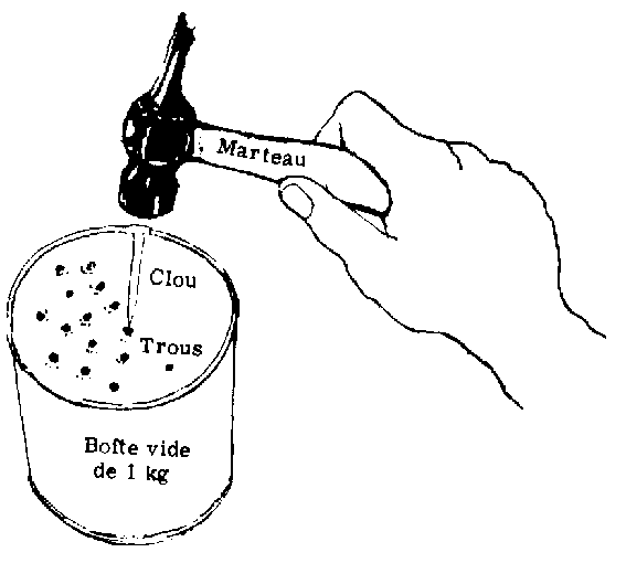 D'après ces recettes, il est clair qu'une passoire est utile pour la préparation des aliments destinés aux enfants. Elle sert à transformer un aliment solide en une matière de consistance fine et légère convenant à un enfant qui n'a pas encore de dents ou très peu. La plupart des ménages possèdent une passoire; sinon, il est facile d'en fabriquer une en perçant 20 à 30 trous dans le fond d'une boite de conserve vide, à l'aide d'un clou de taille moyenne. On obtiendra ainsi un ustensile parfaitement convenable (figure 62).
