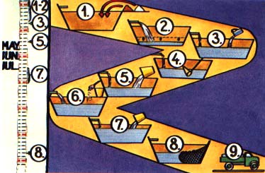 Its most important feature is the good preparation of the dry ponds, including fertilization (1). After half filling the ponds (2), a selective chemical treatment of the water (3) eliminates the cladoceres and the copepods which encourages the strong development of rotifers (4). Then the ponds are stocked with early fry (5). Some supplementary feed is distributed (6), and larger zooplankters are seeded (7). Advanced fry are harvested 21-30 days after the filling of the ponds, depending on environmental conditions (8). They are then transported to fingerling ponds for further rearing (9).