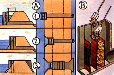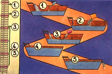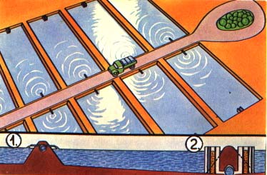 (B) The water outlet provides the possibility of controlling the water level in the pond by using two rows of planks, the space between them being filled with compact clayey soil. In front of these planks, a screen on top of a third row of planks prevents the fish from leaving the pond.