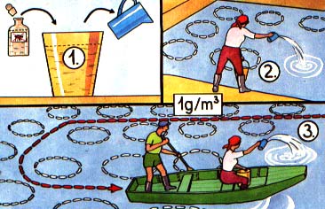 Calculate the volume in cubic metres of the water present in the pond. Take 1 g/m³ water of an agricultural insecticide such as Flibol, Dipterex or Masoten (an organophosphoric acid ester or trichlorfon). (1) Dissolve the total required quantity of insecticide into 101 of water and apply this concentrated solution evenly to the pond.