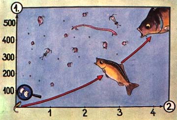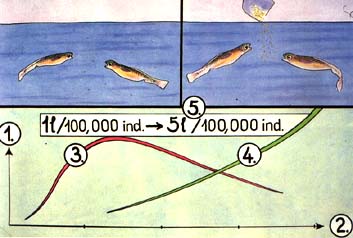 Although both natural and artificial feed are available to the fish from the beginning of the period, the quantity of each type of food consumed (1) varies with time (2). Initially, only natural food is taken, its consumption reaching its peak about 10 days after stocking (3).