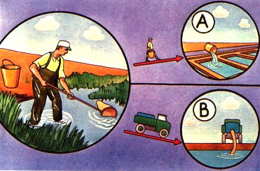 Two feeding methods are used. (A) In small ponds, the artificial food is scattered over the water surface from the banks. On windy days the direction of the wind should be taken into account, as it will tend to agglomerate the floating food in one part of the pond only.