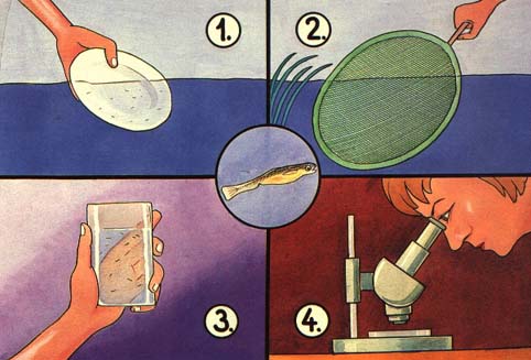 (1) The fry may be observed directly in the pond, using a white plate as a background. (2) They may also be fished easily along the banks and in grassy areas, using a fine mesh dip net. (3) Their swimming behaviour together with their general condition can be observed in a glass of water. (4) The presence of ectoparasites can be detected with a binocular microscope.