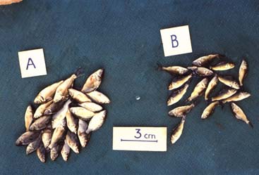 However, for the moment, it is only the rotifers which are valuable food for the growth of the early fry. Therefore, the larger zooplankters should be selectively eliminated (B). This will reduce the food competition of the cladoceres to the profit of the rotifers and it will increase the survival of the rotifers by eliminating their predators, the copepods. The largest copepods which prey on the early fry will also be eliminated.