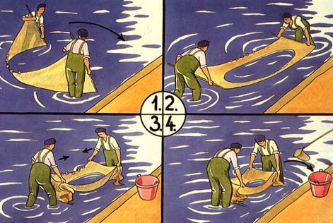 In both cases, the netting is generally nylon curtain material. The seine net is 10-20 m long, according to the size of the pond, and about 2 m high. Secured at each end to 1.20-m wooden poles and mounted on ropes with floats and lead sinkers, it very effectively captures the fry in its baggy central part as it is dragged along the pond bottom.