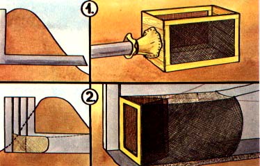 (2) A V-shape net trap mounted on a wooden frame may slid into
