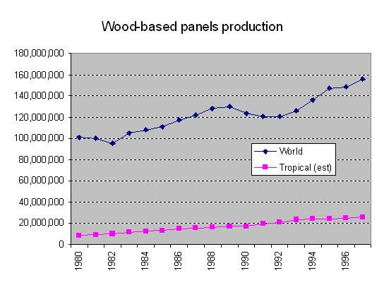 Tropical products only represent a small share of exports for most forest products. For 1997 tropical industrial roundwood production is estimated to represent about 18 percent of world industrial roundwood production; it accounts for varying, but generally small, shares of the total exports of different products: 17 percent of the industrial roundwood exported; 8 percent of sawnwood; less than 10 percent of pulp and paper and paperboard products; and 36 percent of wood-based panels. It does however account for about 70 percent of plywood exports. The share of world production accounted for by tropical products has risen overall, but, while its share in trade has increased for wood-based panels it has declined for industrial roundwood and sawnwood.