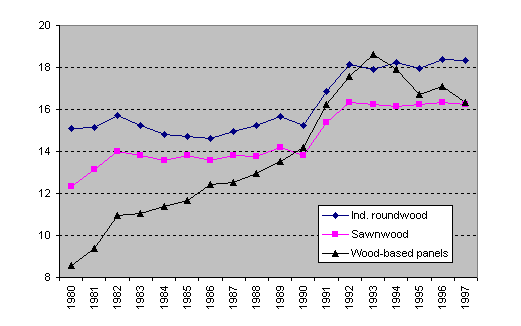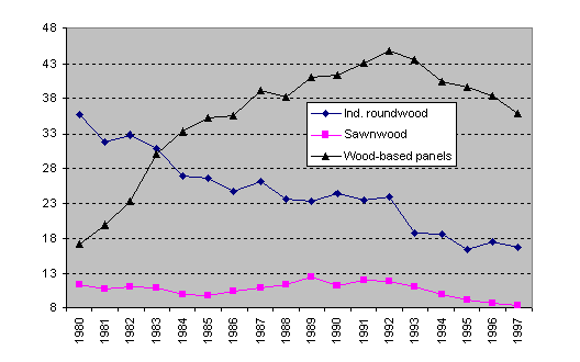 The rising trend in export volumes depicted in Figure 1 represents an expansion in the share of total production being exported for all products except industrial roundwood - in most cases a substantial increase in their share.