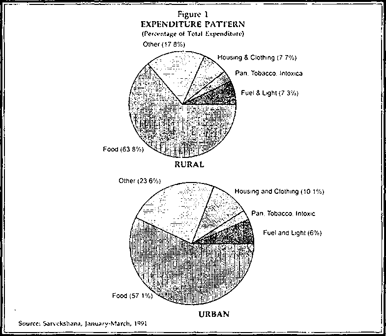 Apart from the NSSO data, we also have data thrown up on expenditure pattern by the surveys conducted by the National Nutrition Monitoring Board of the NIN. It has been found that 63.8 per cent of expenditure was on food items in rural areas and it was 57.1 percent in urban areas. (Nutrition Trends in India NIN, 1993).