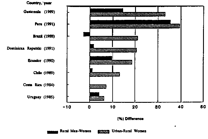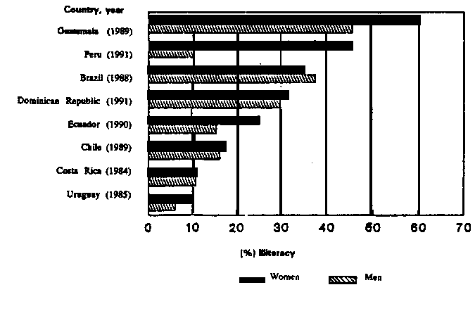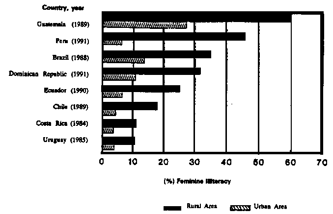 In the rural population, women generally obtain an inferior education than do men. The rural, feminine illiteracy rates in the Regional countries fluctuated between 19.2% and 48% in 1985 (CEPAL/CELADE 1993:57). This situation is worse in Peru where the difference between men and women is nearly 35 percentage points. Costa Rica, with almost no difference and Brazil, where the rural masculine illiteracy rate is greater than the feminine one by approximately 3 percentage points (Graph 8), are the exceptions to this tendency.