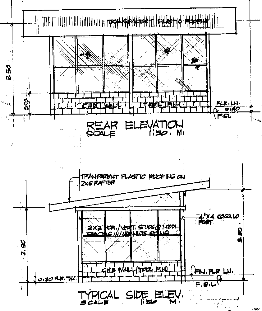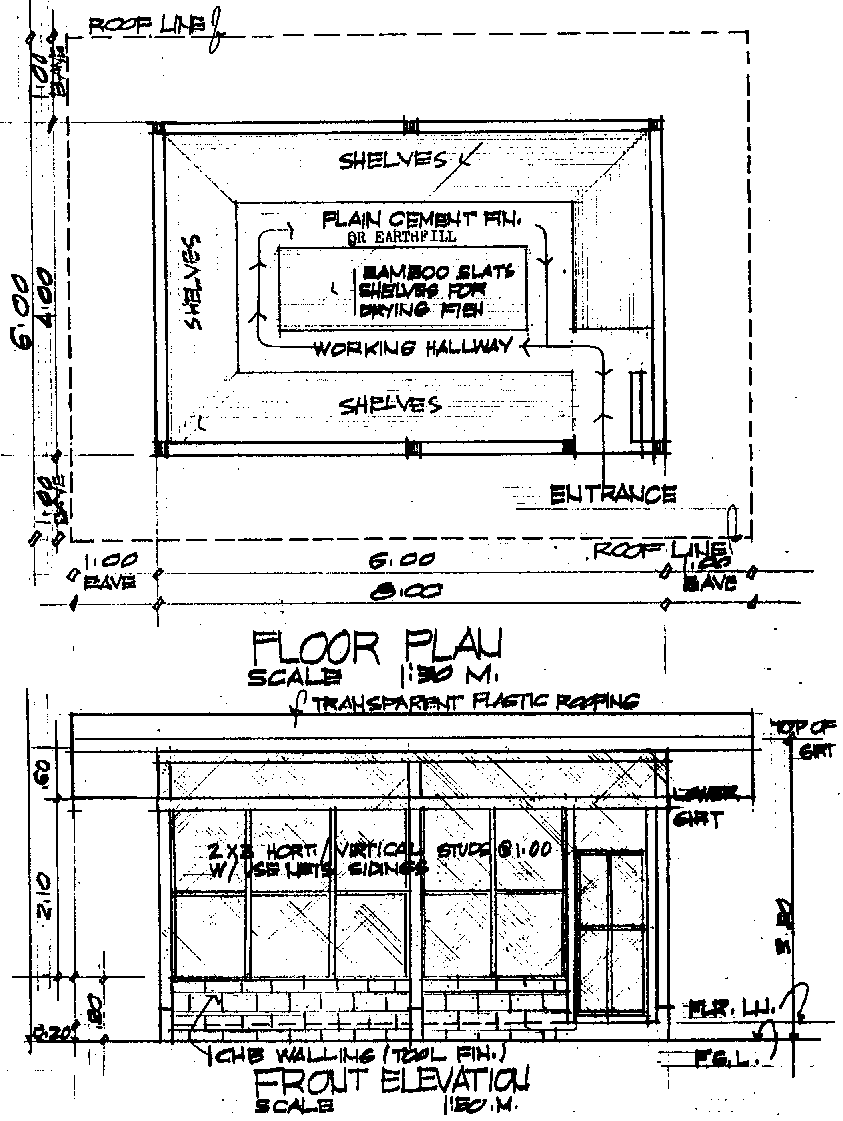 The drying process can be improved by setting up a bunkhouse for drying fish. This structure (Schematic Diagrams are presented in Figure 2) can serve dual purposes: working area for splitting and cleaning of fish and drying area. It utilizes indigenous materials and may be constructed by modules of 6 meters by 4 meters per unit depending on the target production volume.