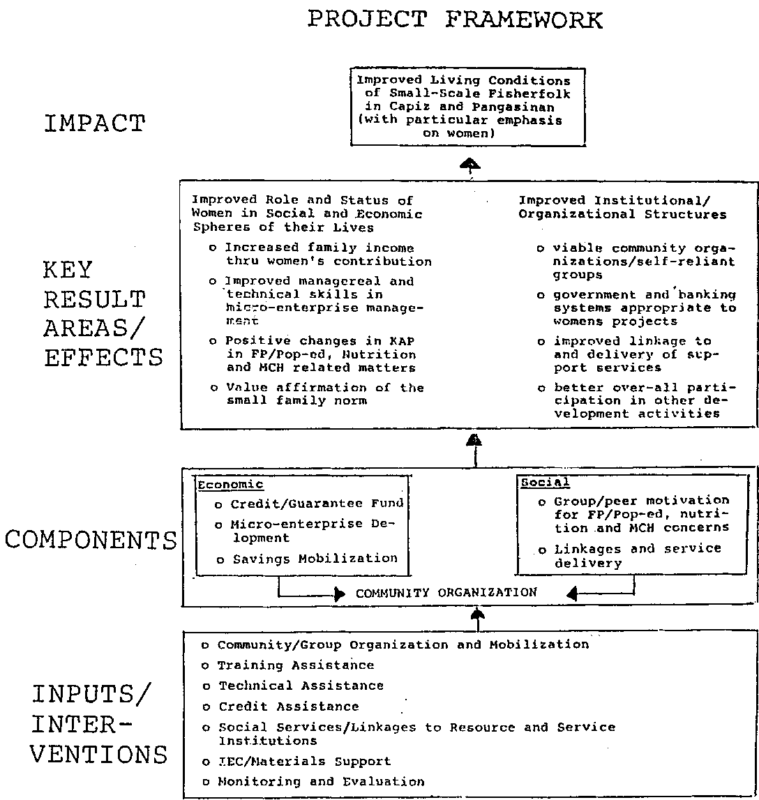 Economic inputs will be provided in the form of revolving fund, to support income-generating activities of the women. Social development focus will be in areas related to population education, family planning, MCH and nutrition. Based on the same community organization principle, these groups will organize and manage their own concerns in both economic and social development concepts. The groups will manage their own motivation strategies and facilitate required services.