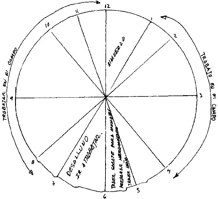 RELOJ DE 24 HORAS: Ellos realizan dos relojes de los cuales uno corresponde a las actividades del día que inicia a partir de las cinco de la mañana hasta las cuatro de la tarde y que corresponde al trabajo de campo; y otro reloj en donde mencionan las actividades después de llegar del campo' iniciando a las cinco de tarde hasta las nueve de la noche; periodo en el cual la actividad principal es de participar en reuniones y coser en maquinas.