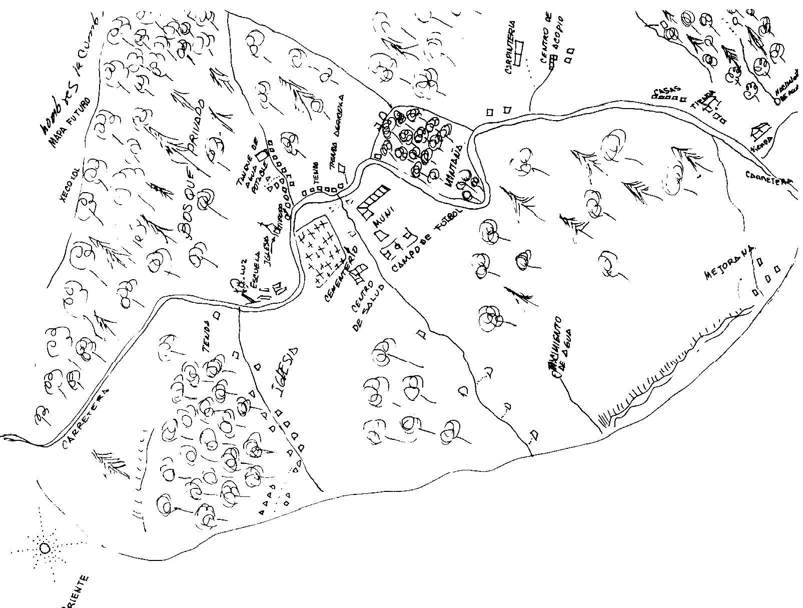 MAPA ACTUAL: En dicha herramienta dan prioridad a los bosques, montañas, los limites o sus colindancias y las corrientes de agua, tierras destinadas para el cultivo, identificando las viviendas con cuadritos, las iglesias y de algunos servicios con que cuentan.