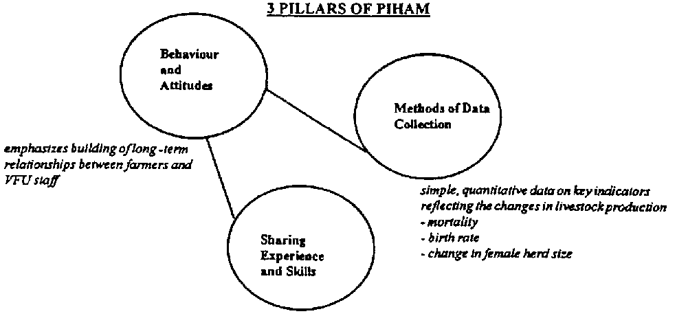 The participatory approaches used in PIHAM are developed on three foundations, or "pillars" (see Diagram 1 above). One of the key strengths of PIHAM is the recognition of the need to maintain continuous contact between farmer and VFU staff to build farmer confidence and facilitate the collection of information essential for responding to the needs of farmers. From other experiences, it was recognised that as the relationship between the two improves, so does the potential to respond to the problems identified by farmers.