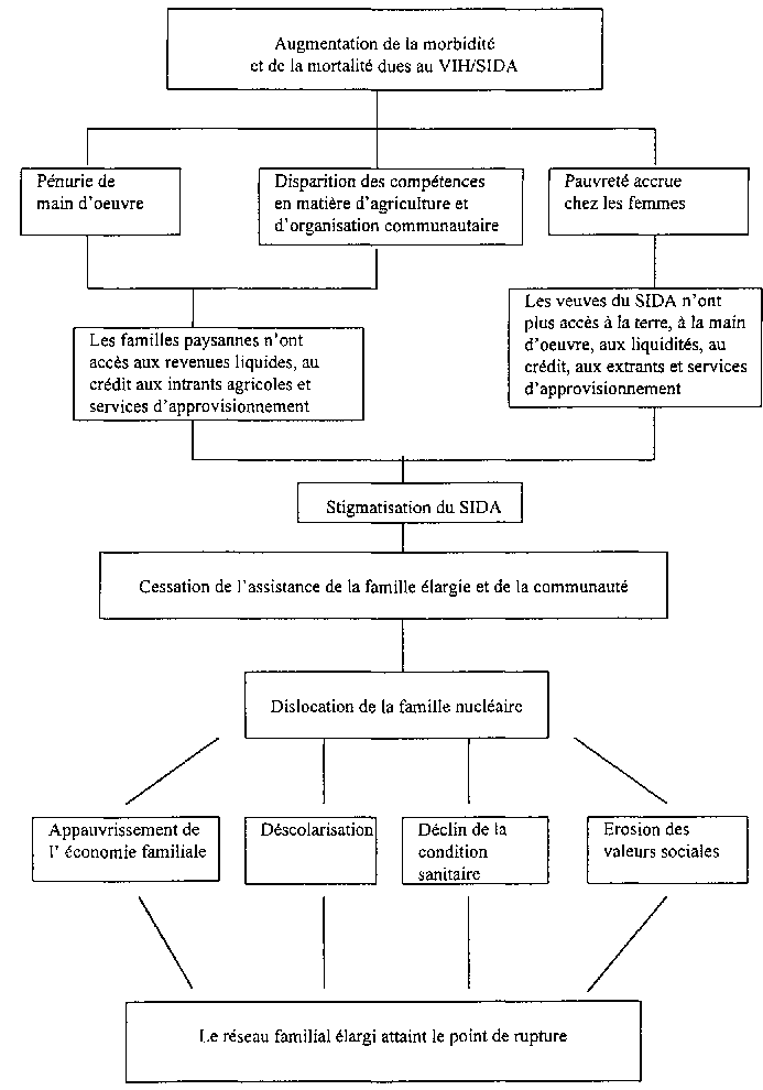 En outre, l'on a observé que la baisse des revenus agricoles due à un déclin de l'intensité des cultures et de la production animale, et qui s'accompagne d'une augmentation des frais médicaux et des frais d'obsèques, peut conduire à une dislocation de la famille nucléaire et du système traditionnel d'entre-aide. Le Tableau 2 présente les liens réciproques entre l'accroissement de la morbidité et de la mortalité dues au VIH/SIDA, le manque d'intrants agricoles et de main d'oeuvre, la détérioration de l'économie familiale et l'impact sur l'éducation, la santé ainsi que sur le système social et qui, en fin de compte conduisent à une dislocation des mécanismes traditionnels de survie.