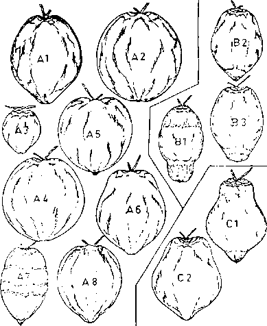 - Fig. 1. Shapes of different forms of coconuts found in Sri Lanka: Forms of typica variety: A1-typica, A2-Kamandala, A3-bodiri, A4-navasi, A5-ran thembili, A6-gon thembili, A7-pora pol, A8-dikiri pol; forms of nana variety: B1-dwarf green, B2-dwarf yellow, B3-dwarf red; forms of aurantiaca variety; C1-thembili (King coconut), C2-navasi thembili (Liyanage 1958).