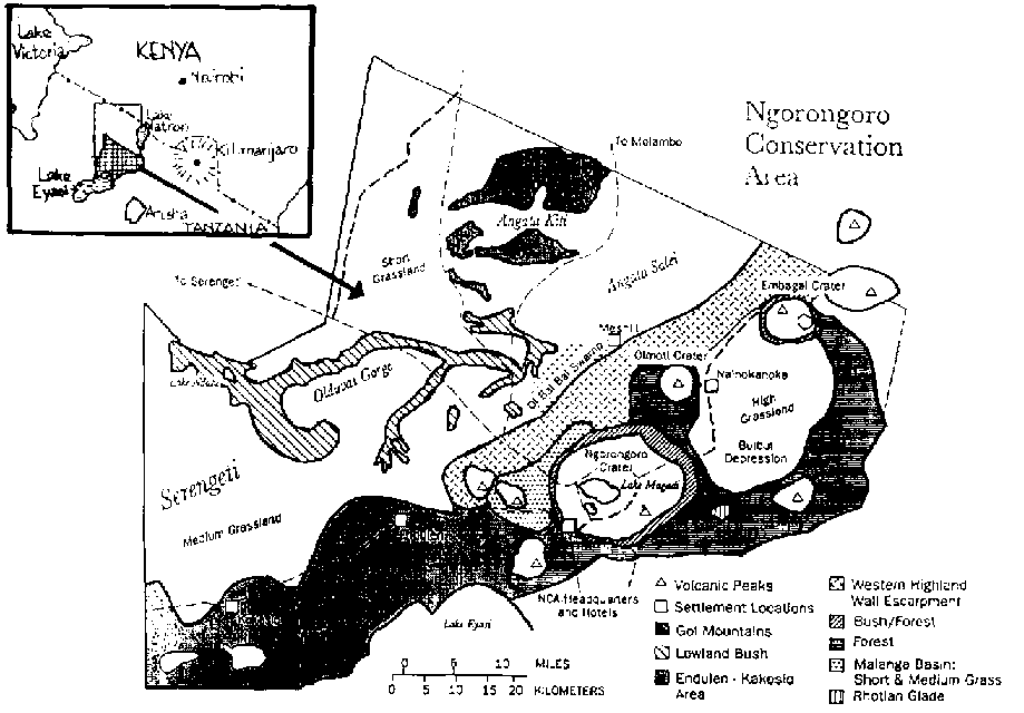 Conservation values The Ngorongoro Conservation Area (NCA) covers over 8,000 square kilometers on the Southeastern margins of the Serengeti National Park. It can be divided into five regions: The crater highlands rising to over 3,000 meters: the gently undulating Salei plains and the Gol mountains to the North; a portion of the Serengeti's 'short grass' plains in the West: and the Kakesio hills and Eyasi escarpment to the South. Rainfall varies greatly giving rise to many different types of vegetation, from montane forest and grassland on the highland to dry woodland on the escarpment and semi-arid grassland on the plains. Ngorongoro sustains the highest concentration of wildlife on earth during the annual migration when over a million wildebeest, half a million gazelles and a quarter of a million zebra come in from the Serengeti. The crater itself has a particularly high concentration of prey and predator species including lions and cheetah. It also provides a refuge for elephant and one of the last remaining wild populations of black rhinocerous in East Africa. The NCA includes sites of archaeological importance: Olduvai Gorge and the Laetoli site, providing evidence of human occupation for nearly four million years. Pastoralism has been practiced in Ngorongoro for at least 7,000 years and the Maasai have lived there for two centuries. Today there are over 40,000 residents with 150,000 livestock units (cattle, sheep and goats) which move between dry and wet season grazing areas. In addition to the Maasai, small populations of Tatoga pastoralists and Hadza hunter-gatherers live east of lake Eyasi in the south of the NCA. The conservation area was established in 1959. It is a World Heritage site since 1979 and has been classified as a Biosphere Reserve by UNESCO. (Source: Charles Lane, 'Ngorongoro Voices', forthcoming from FTPP) |