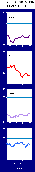 de disponibilités dans plusieurs pays exportateurs. Les excédents mondiaux de sucre persisteront pour la quatrième année consécutive en 1998/99, car il est attendu que la croissance de la production dépasse une fois de plus la consommation. De ce fait les prix du sucre devraient poursuivre leur tendance à la baisse. |