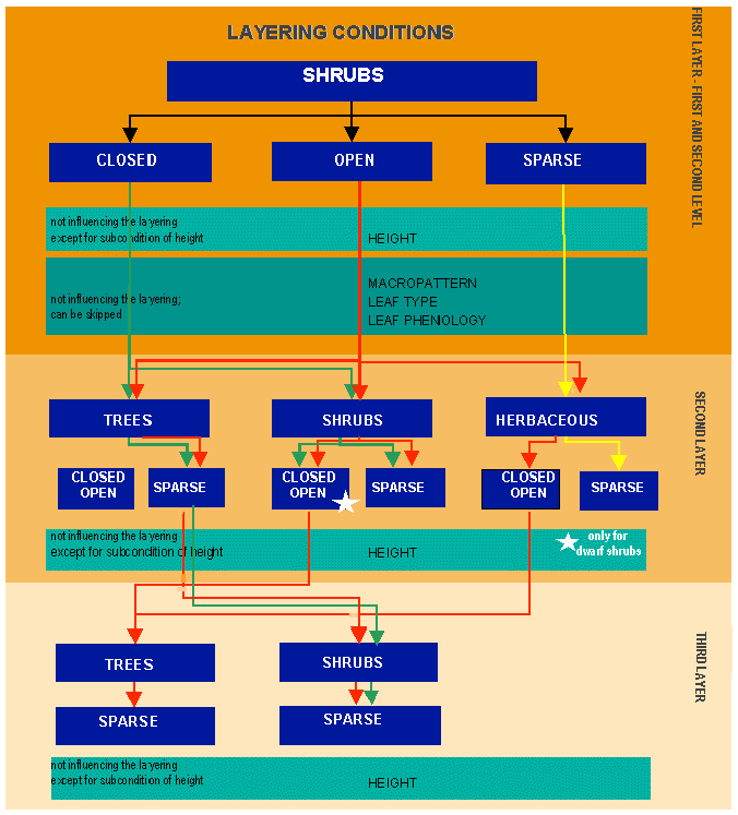 The user can describe up to three layers for (Semi-)Natural Terrestrial Vegetation (A12) and two layers (including the main layer) for Aquatic or Regularly Flooded Vegetated Areas (A24). The limited number of layers at their disposal may disappoint users, but the classifier Stratification should contribute to the structural definition of a vegetation class. This means that this classifier must consider all the possible combinations with the main Life Form selected and its Cover (e.g., if we can have layering for Closed Trees, the same must be valid for Closed or Open Shrubs or Closed Graminoids, etc.). The layering is an active component of the class set-up; it is not a mere descriptive (optional and unsystematic) item of the class. The proposed classification allows the user to first build up a land cover class with the use of the classifier Stratification and, if more details are wanted, add a user's description to the standard one, which can contain information on any additional layers/strata.