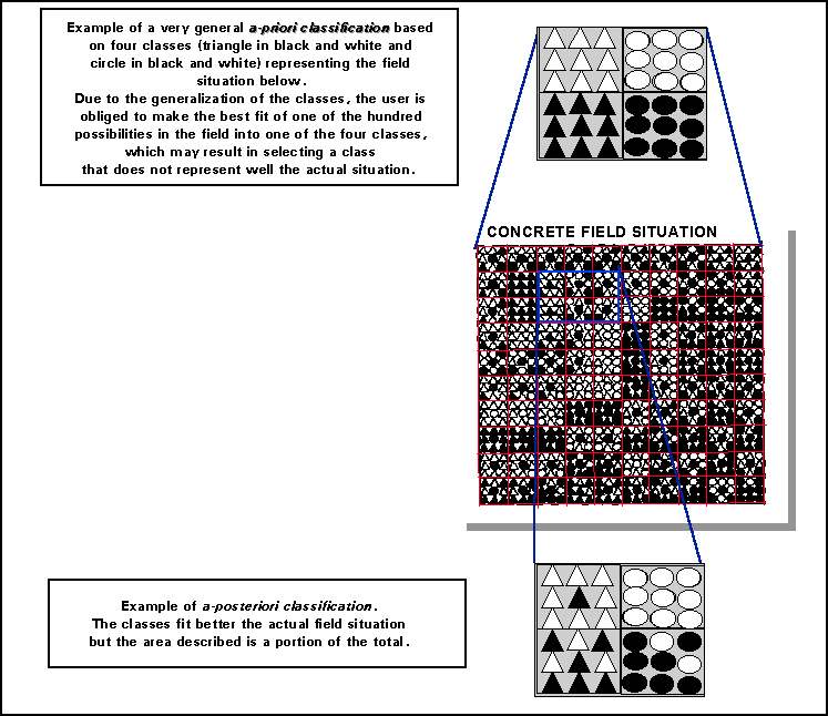 Classification can be done in two ways, that is either a priori or a posteriori (Figure 4). In an a priori classification system the classes are abstractions of the types actually occurring. The approach is based upon definition of classes before any data collection actually takes place. This means that all possible combinations of diagnostic criteria must be dealt with beforehand in the classification. This method is used extensively in plant taxonomy and soil science (e.g., The Revised Legend of the Soil Map of the World (FAO, 1988) and the USDA Soil Taxonomy (United States Soil Conservation Service, 1975)). The main advantage is that classes are standardized independent of the area and the means used. The disadvantage, however, is that this method is rigid, as some of the field samples may not be easily assignable to one of the pre-defined classes.