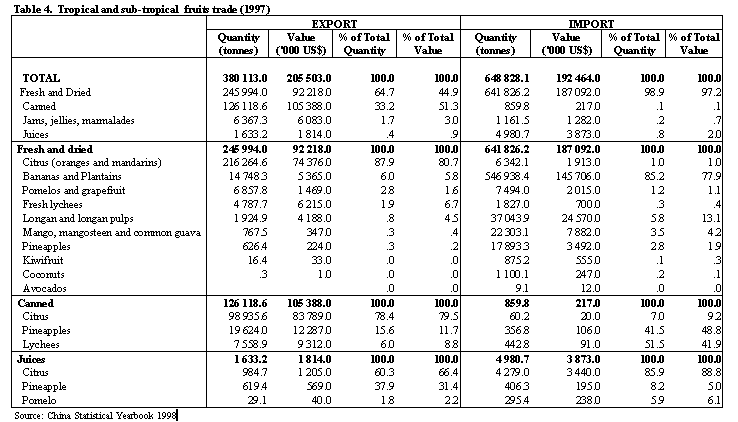 3. China is a net fruit exporting country. In 1997, it imported 691 421 tonnes of fruit worth US$ 210 million and exported 910 356 tonnes valued at US$ 542 million (Table 3). Both exports and imports have increased rapidly in recent years. Generally, China exports temperate fruits and imports tropical fruits. However, a significant quantity of tropical fruit (38 percent of the total fruit shipped) is also exported. Mandarins, apples, pears and apricots were the dominant exports, while bananas, longans and longan pulp, mangoes and mangosteens were the major imports.