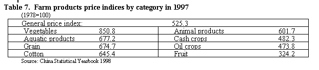 10. As for prices, the dynamic growth of fruit output has dampened prices considerably. Taking 1978 as a base year (1978=100), the general price index in 1997 was 38.3 percent more than the fruit price index (Table 7).