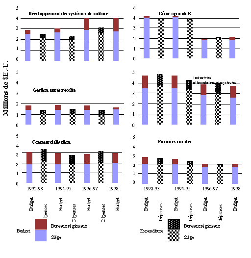 63. Les Sous-Programmes Développement des systèmes de culture et Gestion après récolte ont été particulièrement gênés par le problème des postes vacants en 1996-97. Il était difficile de pourvoir les postes devenus vacants pendant cette période, à cause du déficit budgétaire de l'ensemble de l'Organisation. Les Sous-Programmes Commercialisation et Finances rurales sont ceux qui ont été le moins touchés par ce problème. De nouveaux postes régionaux ont été créés au début de l'exercice 1996-97, mais les effectifs n'ont pas pour autant augmenté de façon significative jusqu'à l'exercice biennal actuel (1998-99). Le Sous-Programme Génie agricole est le seul à avoir connu une importante réduction de postes, alors que les postes affectés au Développement des systèmes de culture ont augmenté de façon substantielle, tant au siège que dans les régions. Dans l'ensemble, le nombre de postes a augmenté, principalement dans les régions.