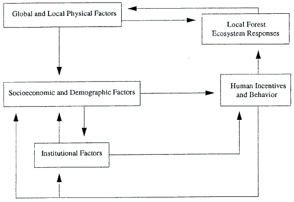 Governments, citizens, and scientists are increasingly concerned about the role of forests in global environmental change. Evidence is mounting from multiple studies that humans at an aggregate level are exploiting forests at unsustainable rates in tropical regions.1 While some deforestation can be attributed to rational and sustainable transfers of land to agricultural and other valuable uses, unplanned deforestation can generate significant negative externalities: loss of biodiversity, elevated risk of erosion, floods and lowered water tables, and increased release of carbon into the atmosphere associated with global climate change. More importantly, deforestation can decrease the welfare of forest users by eliminating habitat for game species, altering local climates and watersheds, and destroying critical stocks of fuel, fodder, food, and building materials.
