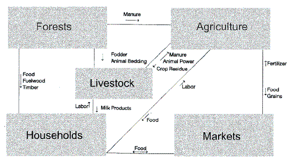 Figure 3.1 outlines the importance of forests in the hill agricultural and subsistence economy by tracing the links between forest products villagers harvest, and the kind of needs such products fill. It is obvious that forests are the cornerstone of subsistence in the hills, contributing critical inputs to each element of the subsistence economy-the household, agricultural fields, and livestock rearing. In addition, panchayat forests containing chir pine (Pinus roxburghii) also yield resin for turpentine, a commercially valuable product.