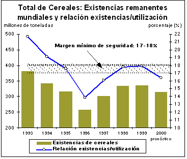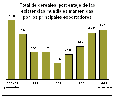 Si se realizan las previsiones actuales tocantes a la disminución de la producción mundial de cereales en 1999, los remanentes mundiales de cereales acusarán una reducción significativa por primera vez desde 1996, pese al crecimiento lento de la utilización previsto en la próxima campaña. Por consiguiente, las existencias mundiales de cereales al final de las campañas comerciales del 2000 se cifran provisionalmente en 315 millones de toneladas, lo que representa una disminución de unos 23 millones de toneladas, equivalentes al 7 por ciento, respecto a sus niveles de apertura. En base a esto, la relación entre las existencias y la utilización puede descender ligeramente por debajo del 17-18 por ciento que la Secretaría de la FAO considera el mínimo necesario para salvaguardar la seguridad alimentaria mundial, y anuncia un equilibrio más estrecho entre la oferta y la demanda mundiales. Tomados individualmente, es probable que las existencias de trigo sean las que más desciendan, a 122 millones de toneladas, lo que representa una disminución de 16 millones de toneladas respecto al nivel inicial. Según las proyecciones, las existencias mundiales de cereales secundarios alcanzarán los 140 millones de toneladas, 6 millones de toneladas menos que sus niveles de apertura, mientras que la disminución de las existencias arroceras debería limitarse a alrededor de 1 millón de toneladas. La merma se concentrará principalmente en las existencias de los países importadores. El descenso de las existencias totales de cereales de los grandes exportadores debería ser pequeño, considerando que las perspectivas de su producción son relativamente buenas y que con probabilidad la utilización interna y las exportaciones seguirán registrando un crecimiento lento. En efecto, a pesar de la reducción prevista de las existencias de los principales exportadores en vista de la fuerte disminución de los remanentes de los países importadores, la proporción mundial de las existencias de los principales exportadores debería aumentar por cuarto año consecutivo.