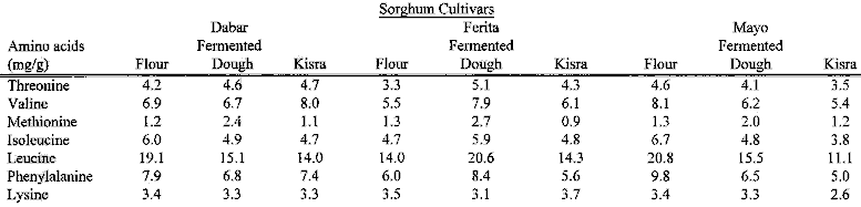 Table 6: Essential amino acid profiles for flour, fermented dough, and kisra produced from Three Sorghum Cultivars*