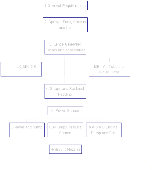 Each module relates to a major component or a functional group of components from which consistent specifications for complete spraying machines can be compiled. The various modules for portable sprayers are shown in Figure 1.
