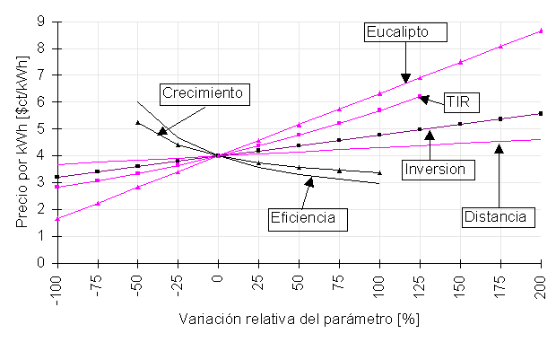 Figura 13. Análisis de la sensibilidad del costo por kWh utilizando leña derivada de eucalipto durante el período de la no-zafra respecto
