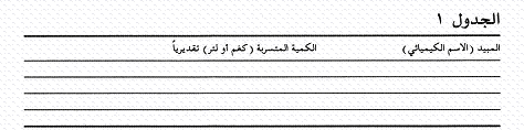 يدرج في الجدول 1 أدناه جميع المبيدات التي تكون قد تسرب أو أنسكب منها شيء في الموقع ثم يستخدم الجدول 2 فيما يلي لتقدير أي من المبيدات المتسربة (المنسكبة) يمكن أن تكون محدثة للتلوث.