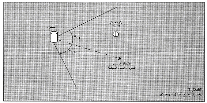 بعد ذلك يحدد الربيع الواقع أسفل المجرى (downstream quadrant) برسم خطين تكون الزاوية بين كل منهما وبين الاتجاه الرئيسي لخط سريان المياه الجوفية 45ْ كما هو موضح في الشكل 2 أدناه.