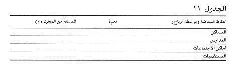 يستخدم الجدول 11 لتسجيل جميع المواقع المعرضة للتلوث في المنطقة المجاورة للمخزن (في حدود دائرة نصف قطرها 300 متر)، والتي يمكن أن تكون الطبقة السطحية للتربة قد لوثت بواسطة الرياح.