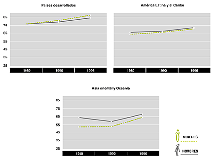 FIGURA 2A Tasas brutas de matrícula escolar (a todos los niveles) por sexo, 1980, 1990 y 1996 (Países desarrollados, América Latina y el Caribe, Asia oriental y Oceanía) |