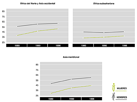 El Cuadro A muestra que las tasas de analfabetismo han disminuido considerablemente tanto para los hombres como para las mujeres, pero siguen siendo mucho más altas para éstas que para aquéllos salvo en los países desarrollados y en América Latina. Asia meridional tiene la tasa más alta de analfabetismo femenino (63 por ciento), así como la mayor discrepancia entre hombres y mujeres (26 por ciento). Vienen a continuación África del Norte y Asia occidental con el 56 por ciento, seguidas del África subsahariana y de Asia oriental y Oceanía con el 53 por ciento y el 24 por ciento respectivamente.