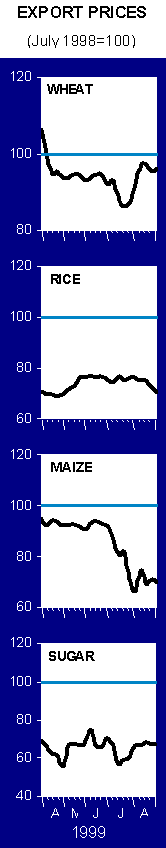 International cereal prices remain mostly below the previous year, but wheat prices firmed up slightly in recent months, supported by increased trade activity. By contrast, coarse grains and rice prices in international markets fell, mostly in response to good crop prospects and weaker international demand, respectively. Prospects for trade and price recovery in the world meat market remain uncertain as the effects of the 1998 global financial crisis extend into 1999. Global production is forecast to increase 2 percent as feed prices remain low. Record 1998/99 production of oilcrops is confirmed by latest estimates, exceeding the expected increase in demand. Stocks of oilcrop products are likely to increase and prices to fall. World fish production recovered in 1999 due to high tuna and illex catches. With the phasing out of El Niño, the small pelagic fisheries in Chile and Peru are recovering. The prices of tuna and groundfish are anticipated to improve. |