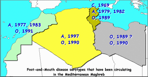 The other FMD serotypes, namely SAT1, SAT2, SAT3 and Asia1, have never been reported in the Mediterranean Maghreb. Serotype A was first introduced into the region in Morocco in 1977, with the importation of frozen meat from South America. This serotype spread to Algeria the same year and to Tunisia in 1979. Serotype A was also introduced from Spain into Morocco in 1983, probably through subclinically affected sheep.