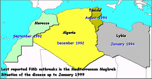 FMD is a notifiable disease in all North African countries. An epidemic of FMD was first declared in February 1999 in Algeria. The disease appeared simultaneously in the wilaya of Souk Ahras (20 km from the Tunisian border) and in Algiers. Up to June 1999, the number of declared outbreaks in the country was 165.