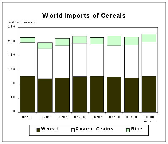Since the previous report the forecast for world cereal trade in 1999/2000 has been raised further by 3 million tonnes, to 221 million tonnes, mainly reflecting stronger demand for wheat and coarse grains than anticipated earlier. At the forecast level, world imports of cereals would exceed the previous year's volume by 8 million tonnes, or nearly 4 percent. The anticipated expansion in world cereal imports is shared equally between the developed and the developing countries. However, among the developed countries, the bulk of this year's increase in cereal imports is likely to be concentrated in only a few nations while in the developing countries, and in particular those in the Low-Income Food-Deficit category, the rise in imports would be shared by several countries. With regard to the outlook for individual cereals, the anticipated expansion in world cereal trade would reflect higher import demand for most cereals, with the exception of rice.