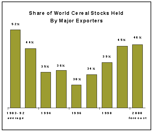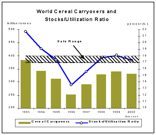 The forecast for world cereal stocks by the close of the seasons ending in 2000 has been raised to 331 million tonnes, up 8 million tonnes from the September report. This latest revision partly reflects upward adjustments (by 3.4 million tonnes) to the estimates of the cereal carryovers from the previous season. At the forecast level, world cereal stocks by the close of crop years ending in 2000 would be nearly 9 million tonnes, or 2.5 percent, below their opening levels. As a result, the ratio of global cereal carryovers to trend utilization in 2000/01 is forecast to fall to 17.3 percent from the previous year's revised level of 18.1 percent, but would remain within the 17 to 18 percent range which the FAO Secretariat considers as the minimum necessary to safeguard world food security. However, although global cereal stocks are forecast to decrease, those held by the major exporting countries, which are the main buffer against any major production shortfall, are expected