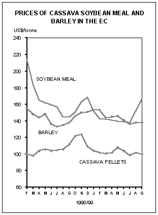 International cassava prices have remained weak in 1999, since abundant supplies have coincided with a weak demand world-wide. Quotations of cassava pellets in the EC (respectively the most important cassava product traded internationally and the main cassava import market) are determined by the domestic prices of grains, especially barley, and the prices of protein-rich meals which supplement cassava to obtain a balanced, grain substituting, compound. In the first nine months of 1999, the EC import price for cassava pellets averaged US$102 per tonne, close to the level prevailing during the corresponding period in 1998, but 36 percent less than in 1993, when implementation of the CAP reform began. Quotations for barley in the EC in the first nine months of the year have also remained mostly unchanged and have averaged US$144 per tonne in Spain, one of the major cassava users in the Community. Soybean meal prices, on the other hand, fell to US$146 per tonne (c.i.f. Rotterdam), or 16 percent below the same period in 1998. As a result, the cassava/soybean meal blend has become slightly more attractive than last year in the EC, which has helped sustain cassava utilization in member states. International prices of cassava starches and flours, which are traded principally among Asian countries, have been on a downward trend for most of the year and have fallen to US$163 per tonne in July-August 1999. Up to August 1999, they have average US$176 per tonne, considerably below the US$305 per tonne prevailing in January-August 1998, and the lowest level since 1988.