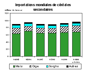 Les prévisions concernant les échanges mondiaux de céréales secondaires en 1999/2000 (juillet/juin) ont été portées à 96 millions de tonnes, soit une hausse de 1,5 million de tonnes par rapport aux prévisions précédentes et de 3,7 millions de tonnes par rapport au volume estimé des importations de l'an dernier. Cette dernière révision à la hausse concerne essentiellement les pays d'Afrique et d'Amérique du Sud. La hausse des échanges prévue pour cette année concernerait essentiellement le maïs, l'orge et le sorgho. Les échanges mondiaux de maïs se situent actuellement à 69 millions de tonnes, soit 2 millions de tonnes de plus que l'an dernier, niveau le plus élevé enregistré depuis 1995/96. Les importations mondiales d'orge devraient progresser cette année de plus de 1 million de tonnes pour se situer à 17 millions de tonnes, soit le volume le plus important depuis 1994/95. Les importations de sorgho sont évaluées à 7 millions de tonnes, soit un niveau proche de celui enregistré en 1997/98 et 400 000 tonnes de plus que l'an dernier. Parmi les autres céréales secondaires, on prévoit une modeste réduction des importations de seigle, tandis que les importations d'avoine et de mil resteraient stables par rapport à l'an dernier.