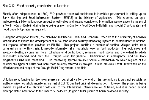 5. Monitoring Food Security Over the last two decades, a number of countries, particularly in Africa, have set up food early warning systems, often with the assistance of agencies such as FAO. In addition the Global Information and Early Warning System on Food and Agriculture in FAO produce bulletins for their member countries such as the quarterly Food Supply Situation and Crop Prospects in Sub-saharan Africa. In this section, the function of these monitoring systems will be discussed, and the appropriate food security indicators which should be monitored. 5.1 The need for a food security monitoring system The general rationale for food security monitoring systems is to provide information about developments in food security that can form the basis for government policy intervention and programme design. Food emergencies can be averted if information reaches the relevant decision makers at an early enough stage. Food imports can be ordered, or pesticides can be delivered to the regions under pest attack, or, if all else fails, food distribution systems can be activated. Food and financial aid can be requested through donor appeals. To do this, reliable information is necessary, which is accepted by national and international institutions as reasonably accurate. This gives some indication as to the necessary attributes of a monitoring system. Most important of all, it must be instituted in such as way as to be part of or report to an organisation which has a response mechanism. Monitoring systems are expensive to set up and this expense can only be justified if the collection of information informs action and policy. Monitoring cannot be an academic exercise. It should result in improvements in programme design and delivery and more appropriate policy implementation. The issue of the linkage between the monitoring system and the relevant decision making body is as important as the structure and content of the monitoring system itself. Monitoring systems can be loosely classified into two types. National and Global monitoring systems have strengths in reporting on food availability at national and regional levels, but tend to be weak in reporting on household physical and economic access to the food available. Local and household based monitoring systems tend to be much stronger on monitoring access, but are often poorer at building up a picture of overall food availability. Information may be explicitly collected for the monitoring system, but it is frequently possible to use information which is already collected as part of the country's statistical programme, or as a by-product of existing programmes. When existing data collection systems can be utilised as part of a monitoring system this can cut down costs considerably. Cost effectiveness should be a major criteria in the development of a monitoring system. Money spent on collecting and analysing data could otherwise be spent on programme implementation. This should be kept in mind when the expansion of data collection is being considered. Timeliness is another important element to be considered when developing a monitoring system. This is most obvious when examining an early warning system, where the major purpose is to warn of upcoming food crises. This may be of limited use if it takes three months to analyse the information and report to government. It is also an important factor in other types of monitoring system, whether at the household level or for programme assessment. 5.2 National and global monitoring systems The most common form of national food security monitoring system is the early warning system. These were instituted in many countries in the period immediately after the 1974 World Food Conference. They are based on the assumption that the scale of food crises could be monitored at the macro- level in an economy and that the major issue is one of food availability. Early warning systems often tend to be donor oriented, and one of their major purposes is to alert the donor community to food crises which may require emergency concessional imports. To assess likely food supply, a number of indicators are collected. In most countries, estimates are made of agricultural production in the months leading up to the harvest period. These are supplemented by, and in part may be based on meteorological information. Rainfall may be collected from weather stations and allow for the determination of the probability of rainfall failure. Rainfall monitoring has been enhanced in many countries by satellite remote sensing for monitoring cold cloud formation. In the past few years in southern Africa, satellite sensing has also allowed assessment of vegetative growth, particularly important in assessing grazing in livestock economies. All this improves the estimates of domestic food production. This then can be combined with other information, on planned commercial and concessional imports and estimates of national consumption requirements, to from a simple food balance sheet, which can identify food gaps. More sophisticated and developed early warning systems may also collect information on local market prices, to assess the extent of shortages in various local and regional markets. Although this is referred to food security monitoring, in practice in most countries, the information collected is primarily on cereals. This reflects the existing bias in agricultural statistical systems. This can lead to overestimates of problems in countries where people move quite readily between cereal and root crop consumption. Nutrition monitoring at a national level is not as common as the early warning system, but a number of countries do have operational systems. However, these are frequently disappointing in terms of the information that can be derived from them and the use to which it can be put. All too often, information on nutritional status of children is collected in isolation from the kind of socio-economic information which would allow re